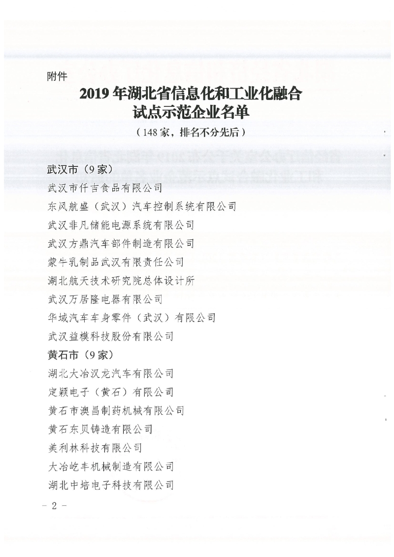 省經信廳辦公室關于公布2019年湖北省信息化和工業化融合試點示范企業名單的通知